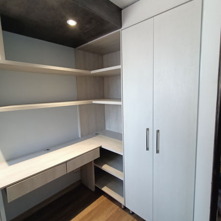 Instalamos una mesa plegable al costado izquierdo, con estantería superior, y un sistema de almacenamiento tipo clóset al costado derecho, optimizando cada metro cuadrado. Pintamos el espacio en un tono azul claro que amplifica la luz, generando amplitud visual y frescura.